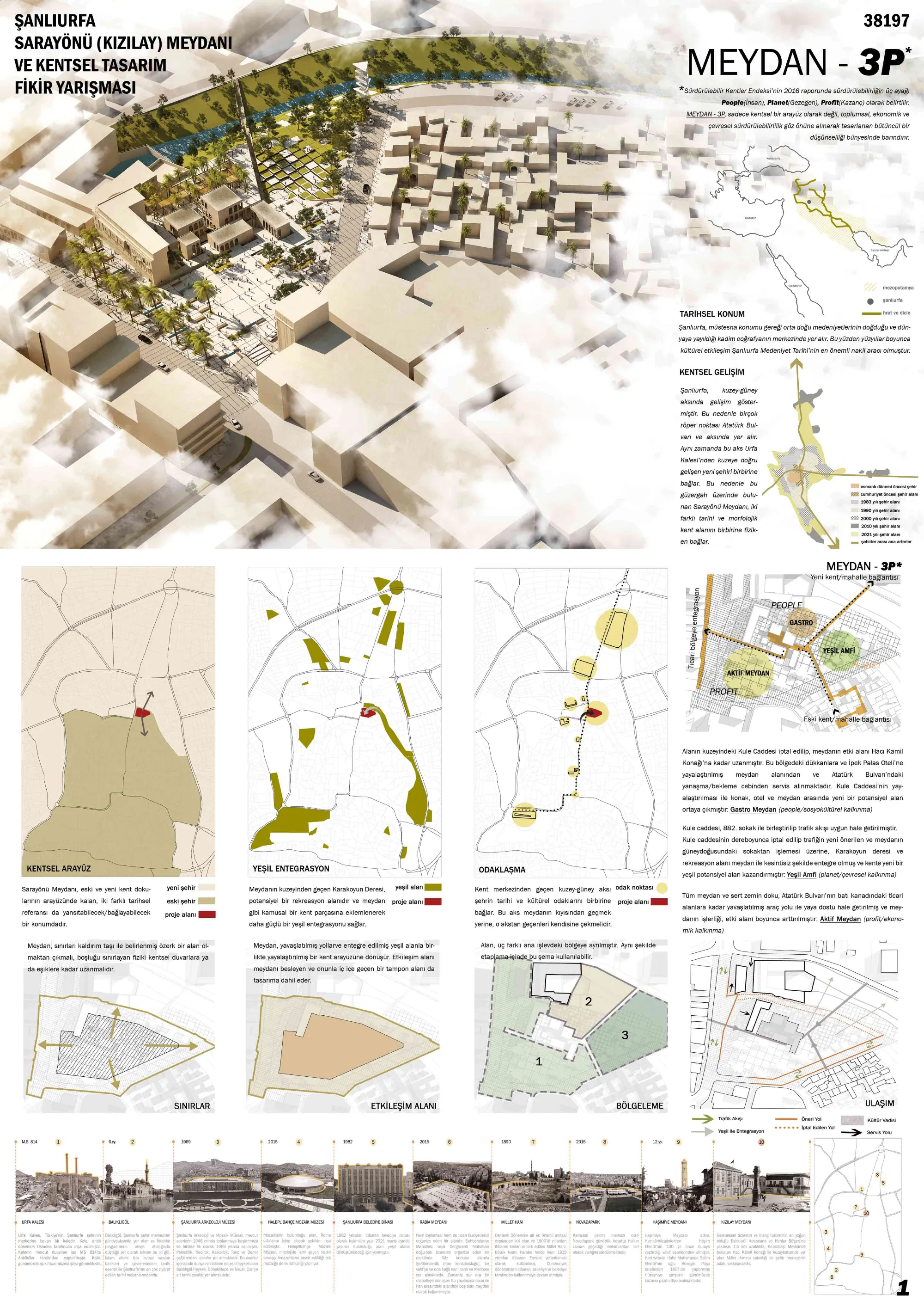 Şanlıurfa has developed on the north-south axis, therefore Atatürk Boulevard has become the most important main artery. This axis starts from the Urfa Castle in the south and extends to the newly developed urban areas in the north. Located on this route, Sarayönü Square physically connects two different historical and morphological parts of the city.