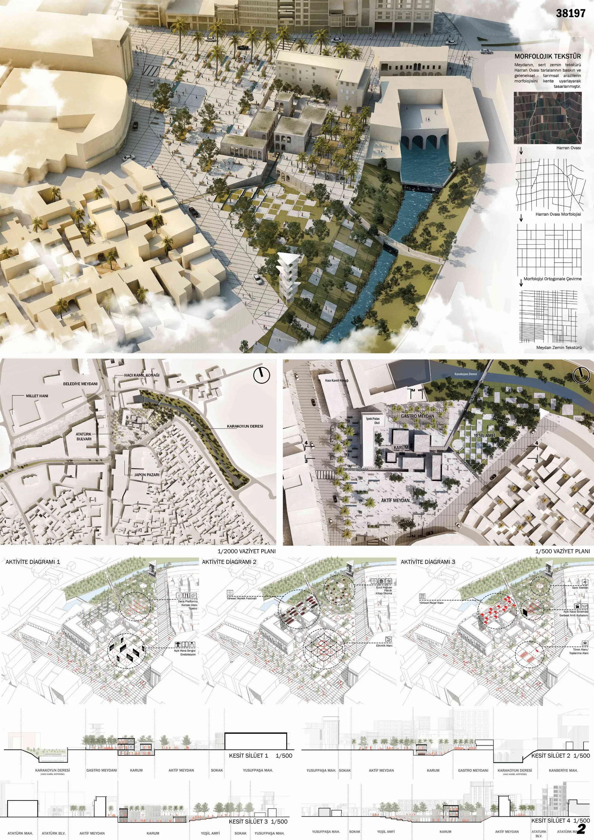 Tower street was combined with 882nd street and traffic flow was streamlined. After the tower street was canceled along the creek and traffic started from the newly proposed street in the southeast of the square, the Karakoyun stream and the recreation area were seamlessly integrated with the square and brought a new green potential area to the city: Green Amphitheater (planetary/environmental development)