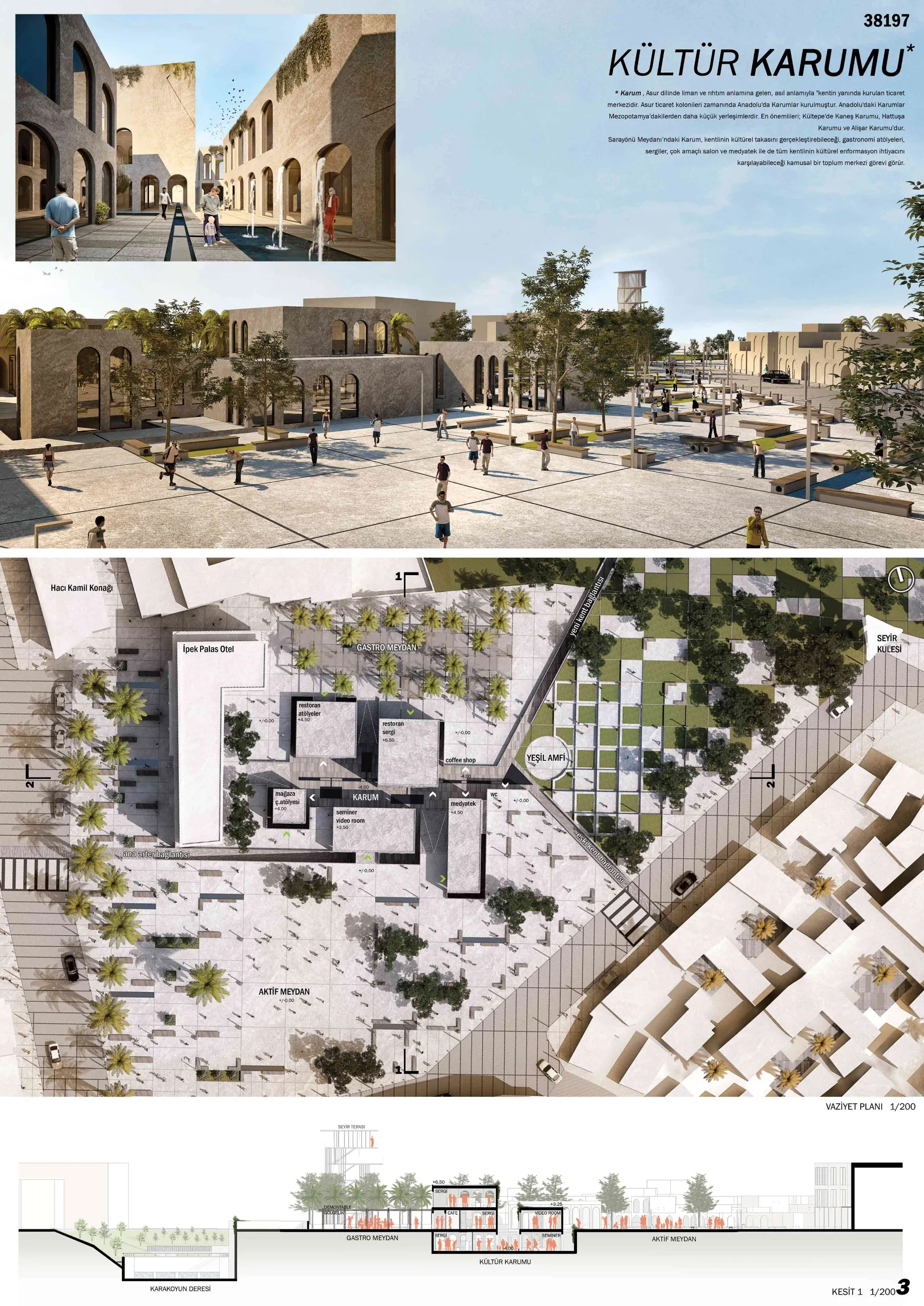 Rather than limiting a public area such as a square to vehicle roads, it should be preferred to slow down the vehicle roads and make the square pedestrian-friendly up to the urban periphery. Karum, with a closed area of approximately 600 m², can be considered as a more comprehensive community center, although it is designed according to the rules of the competition specifications (taks and kaks). The restoration of İpek Palas Hotel and the ground floor areas on the façade facing the Gastro square should be arranged in accordance with gastronomy activities. Thus, a different dimension will be added to the square with the gastronomic synergy that will occur in the region between Karum and the hotel. By-pass traffic, which will be made by pedestrianizing the northern wing of Kule Street in the transportation network and connecting it with 882. Street, can reorganize the traffic. With the cross-sections proposed in the project, the area will be transformed into an open-air center with fewer vehicles, more pedestrianized, not just for gathering purposes, but where time can be spent 24/7.