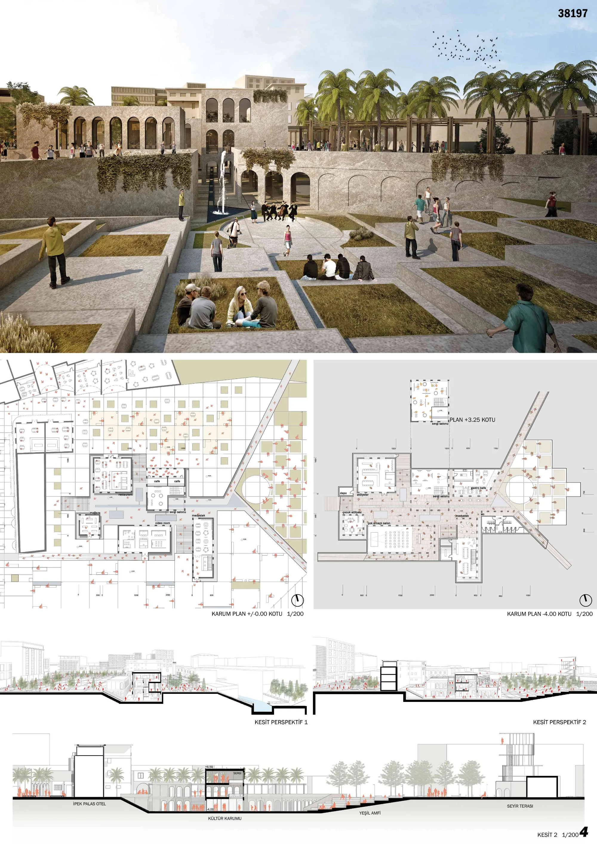 The green amphitheater, on the other hand, offers concerts, picnics, recreation and many similar functions to the citizens by integrating with the stream line. The linear recreation route ends with the last amphitheater and opens to Karum. The area where afforestation is considered especially for shading provides an active use of green space for the city together with the fertile soils of the stream.
