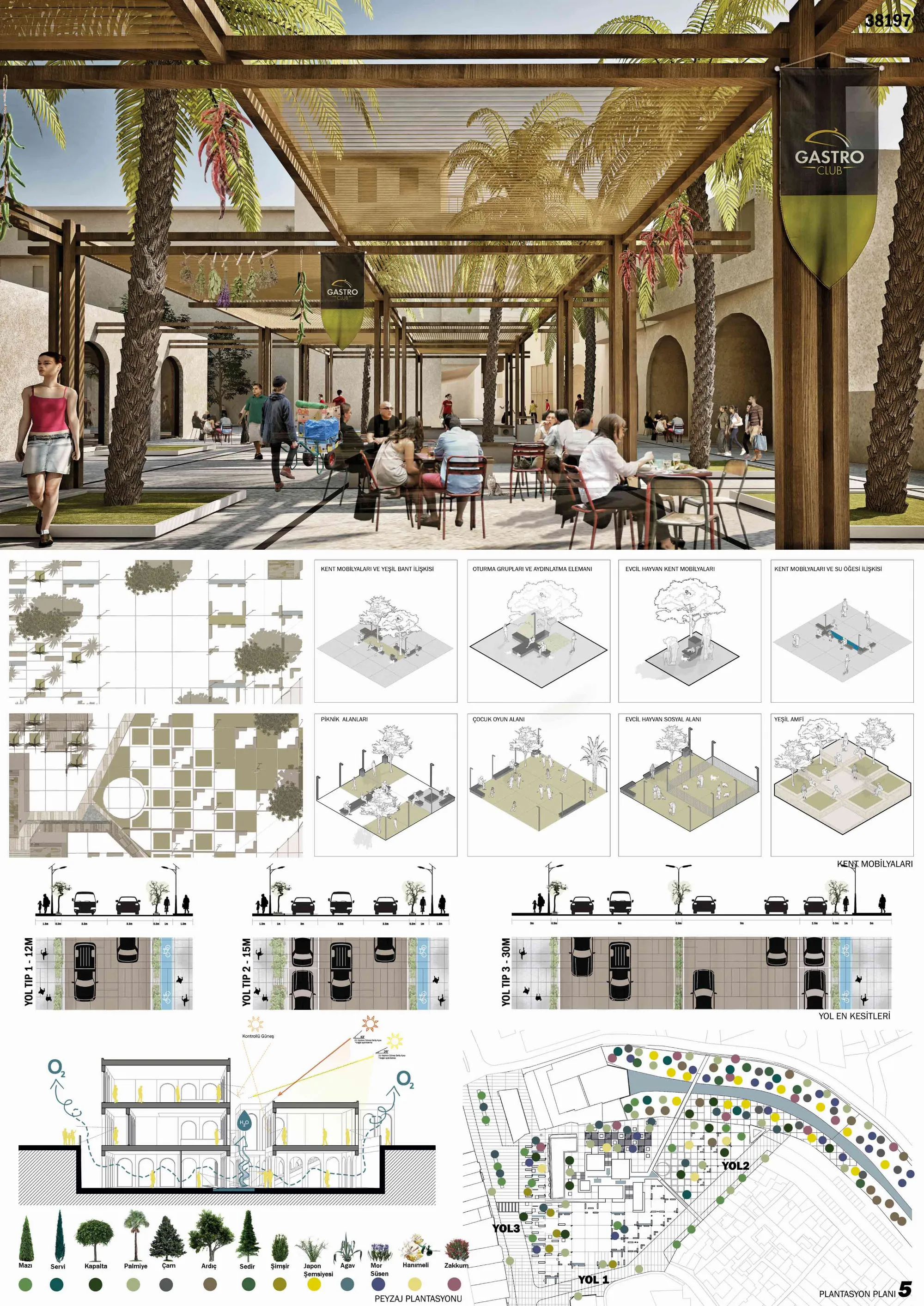 "SQUARE - 3P", which has three different functions, can be arranged according to different events and activities according to the season and different times of the day. A public semi-open is envisaged in the gastro square, supported by both Karum and the ground floor commercial areas around it, such as a food festival, a local market. This top cover, which is designed as demountable with a wooden insert system, allows a comfortable gastronomic experience to be shared with the citizens in the hot and dry season.